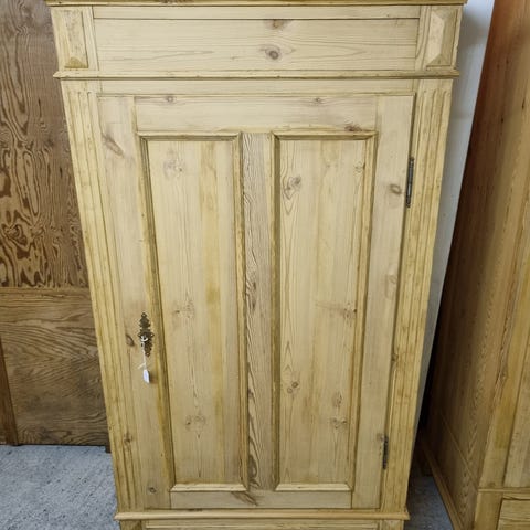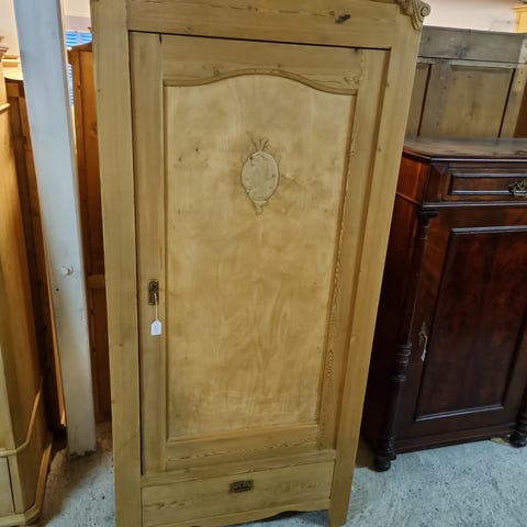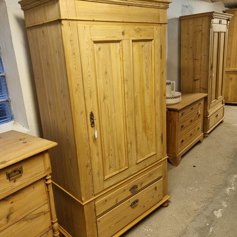 Gammelt antik skab i afsyret fyrretræ med bøjleophæng indvendig samt skuffe forneden. Ny restaureret og fået bivoks men kan sagtens males med en god spærregrunder.