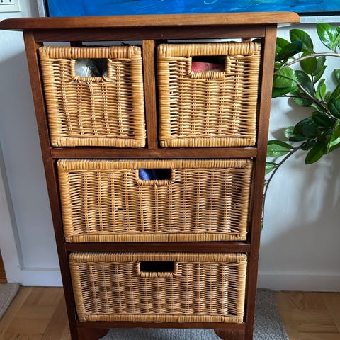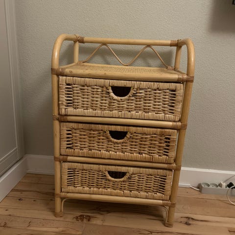 Smuk kommode i bambus og flet kan bruges til mange formål fremstår ren og pæn og stærk og funktionel højde 105,5 på fredag 48,5 dybde 33 cm jeg kan måske hjælpe med levering