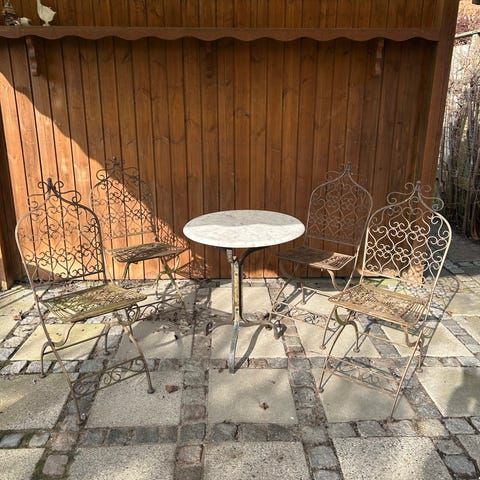 Rund havebord med støbejernsben og marmorplade