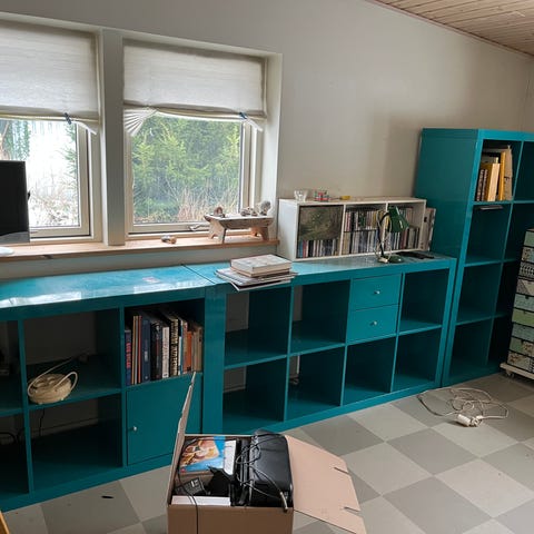 Reol med åbne og lukkede rum i turkis. Reolen har flere kvadratiske rum, nogle med låger og skuffer, som kan bruges til opbevaring af mapper, bøger, kasser og andre genstande. Velegnet til kontor, stue eller værelse, hvor der er behov for overskuelig opbevaring og organisering.