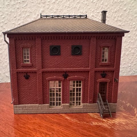 Modeljernbane remise bygning i plast. Bygningen har rødt tegltag, røde murstensdetaljer og lyse vægge. Fronten har store vinduespartier, og den ene gavl har grønne porte, der kan åbnes. Indvendigt er der gennemgang til spor, egnet som lokomotiv- eller vognremise på et modeljernbaneanlæg. Velegnet som tilbehør til modeltog i mindre skala. H0