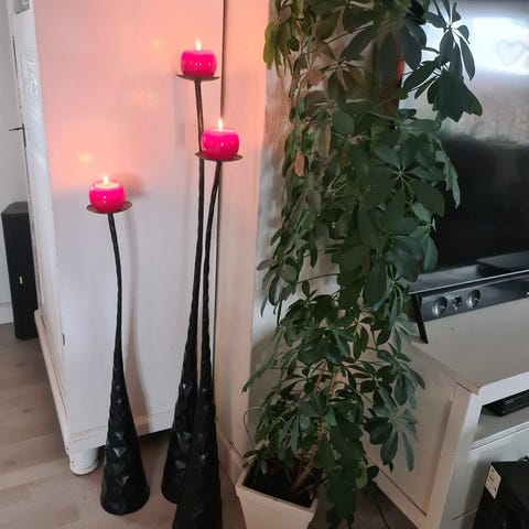 Lysestager som gulvmodeller i metal med sølvfarvet overflade. Høje 74 cm, slanke stager med dekorative detaljer foroven og forneden, velegnet til placering på gulv i stue, gang eller andre opholdsrum. Passer til almindelige stagelys. Neutral, blank finish der kan kombineres med forskellige indretningsstile.