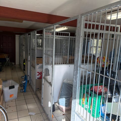 Animal/Dog play pen in black metal that can be set indoors or outdoors enclosure for dogs or any other animal. The sections are joined together and secured with plastic pieces. There is a gate with 3 locks. Can be folded for storage when not in use. Can be also mounted in different shapes (circular or rectangular).