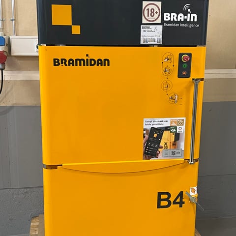 Gross briketpresse industriell maskine til komprimering af træ- eller andet restmateriale til briketter. Maskinen er hydraulisk drevet og er udstyret med styreskab, hydraulikpumpe, slanger og presseenhed med dyse til udformning af briketter. Velegnet til anvendelse i værksteder, produktionsvirksomheder eller andre miljøer, hvor der ønskes reduktion af volumen på restmaterialer og mulighed for videre anvendelse som brændsel eller genbrugsmateriale.