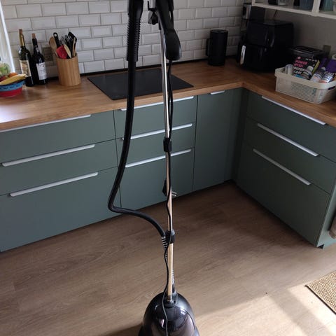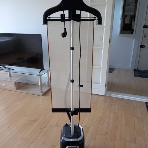 Steamery tøjsteamer i sort. Gulvmodel med vandtank i basen og teleskopstang med damphoved til opretstående dampning af tøj. Velegnet til at glatte folder og friske tekstiler op direkte på bøjlen, fx skjorter, kjoler, jakker og andre beklædningsgenstande.