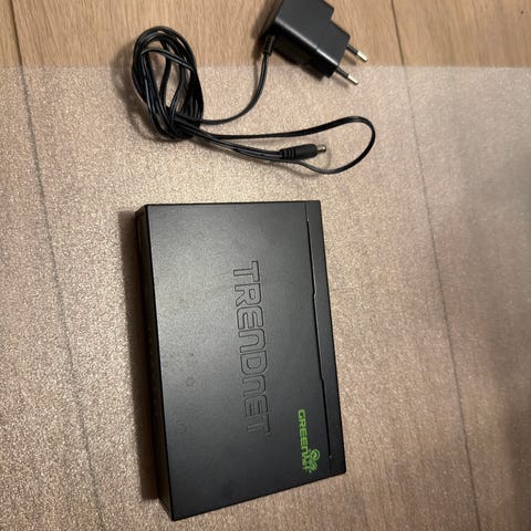 TRENDnet TEG-S16Dg netværksswitch med 16 Ethernet-porte på fronten. Modellen er en uadministreret switch, egnet til kablet netværk i f.eks. hjem eller mindre kontorer. Enheden tilsluttes via strømstik på bagsiden og fordeler netværksforbindelse til flere enheder gennem RJ45-porte. Velegnet til opsætning af lokalt netværk med flere computere, printere eller andre netværksenheder.
