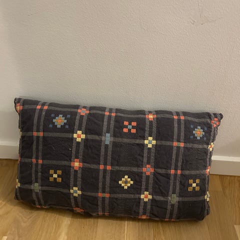 IKEA pude i orange farve med ternet og geometrisk mønster. Puden har et rektangulært format og kan bruges som pyntepude eller støttepude i sofa, lænestol eller seng. Betrækket kan tages af, som vist på billederne, hvilket gør det nemmere at håndtere og opbevare. Velegnet til brug i stue, soveværelse eller andre opholdsrum.