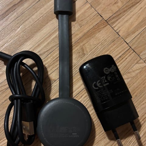 Google Chromecast med HDMI‑tilslutning og medfølgende strømforsyning samt USB‑kabel i sort. Enheden tilsluttes tv’ets HDMI‑indgang og får strøm via den medfølgende strømadapter eller via USB, afhængigt af tv’ets muligheder. Understøtter trådløs streaming fra kompatible telefoner, tablets og computere via Google Home‑appen og kræver trådløst netværk for brug. Velegnet til tv’er med ledig HDMI‑port, hvor man ønsker at streame indhold fra forskellige enheder over wi‑fi. Nulstillet og klar til ny bruger.
