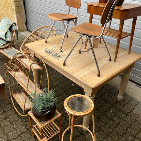 Velholdt, smukt og charmerende spisebord med egetræsplade. Fremstår originalt.
