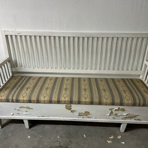 Gammel malet slagbænk med stort opbevaringsrum. 179 lang