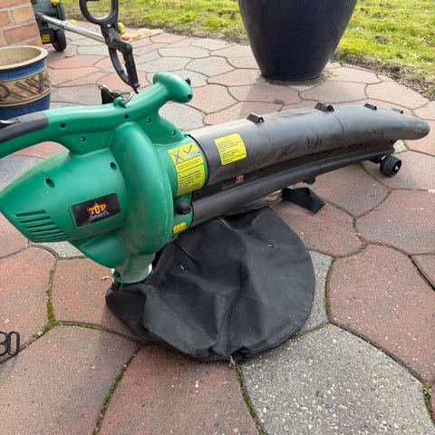 Black & Decker løvsuger med opsamlingspose. Elektrisk løvsuger i orange og sort design, egnet til opsamling og bortblæsning af blade i haven. Med aftagelig pose til opsamling af løv.