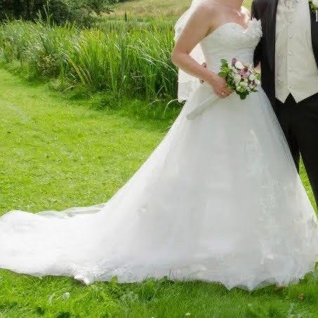 Super flot brudekjole med mange fine detaljer. Der er et ekstra tyl skørt til den. Jeg tror den svarer til en str. 38. Taljevidden er ca 77 cm og fra skulder og ned måler den 155 cm. Den er syet i Taiwan, og der står str. 16 i den.