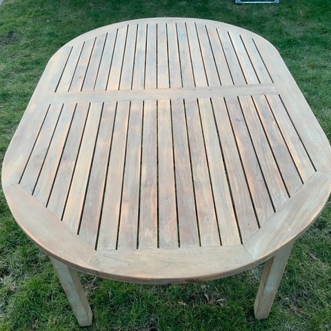 Havebord 200x100x74cm og 6 tilhørende stabelbare stole. Sættet er velholdt og solidt med bordplade og stole i teaktræ og stel i metal. Begge dele er oliebehandlet hvert år fra nyt i 2020. Der medfølger nye uoriginale hynder (lidt højere end stoleryggen). Afhentes i Gilleleje.