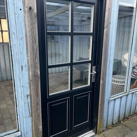 Yderdør og vinduer i træ med blåmalet udvendig side. Døren har fyldninger og et buet glasfelt øverst samt indvendig træoverflade. Vinduerne er sidehængte trævinduer med flere glasfelter. Egnede til udskiftning eller renovering af husets facade, hvor der ønskes klassisk udtryk med træ og glas.