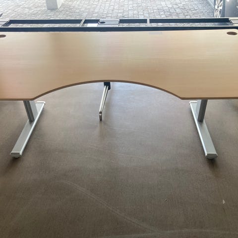 Skrivebord med udskæring i bordpladen og kabelhul i det ene hjørne. Bordpladen er i træfarvet finish, og bordet står på sorte ben. Velegnet som arbejds- eller computerbord med plads til skærm, tastatur og øvrigt kontorudstyr.