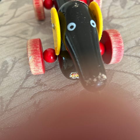 BRIO trælegetøj hund på hjul i malet træ. Figuren forestiller en hund i rød farve med gule ører og grønne hjul samt sort hale med gul knop. Legetøjet er udformet som et lille køretøj, der kan skubbes hen over gulvet. Velegnet som klassisk trælegetøj til mindre børn, der kan øve finmotorik og leg på gulv eller bord. Ingen løse smådele ud over de fastmonterede skruer og hjul, som er integreret i konstruktionen.