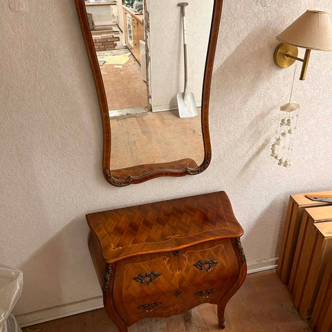 Købt hos Aabenraa Antikvitetshandel i 2020: vippespejl på kommode. Danmark ca. 1760. Kvittering haves.