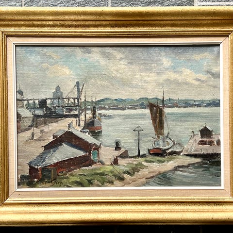 Smukt og stemningsfuldt oliemaleri af den anerkendte danske maler Einar Gross. Motivet viser et klassisk dansk kystparti med hvidkalkede huse og klipper, udført med Gross' karakteristiske brede penselføring og sans for det nordiske lys.