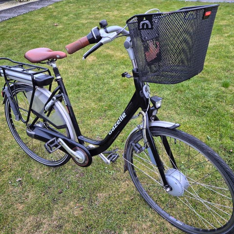 Komplet med lås, to nøgler til lås og to til batteri, oplader, batteri, for og bag lygter, støtteben, bagagebærer og cykelkurv. Fodbremse på baghjul og håndbremse på forhjul.