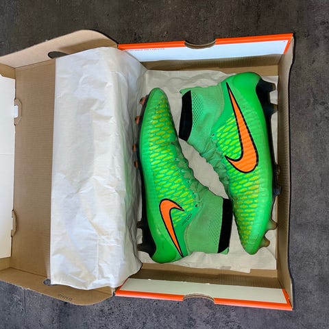 Matchworn Yuito Suzuki’s støvler, se på sidste slide hvor jeg modtag dem. Nike fodboldstøvler i størrelse 43. Støvlerne er i en lysegrøn farve med koralfarvet Nike-logo og snørelukning. Overdelen er i syntetisk materiale, og sålen er udstyret med faste knopper velegnet til fodbold på græsbaner. På hælen er der trykt navnetekst og en autograf-lignende påskrift. Velegnet som fodboldstøvler til træning og kamp for spillere, der bruger str. 43.