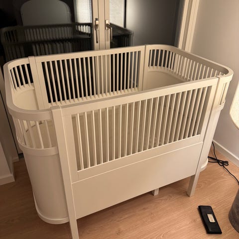 Sebra tremmeseng i hvid. Klassisk tremmeseng, der vokser med barnet og kan udvides til juinorseng. Brugt - men er i super fin stand.