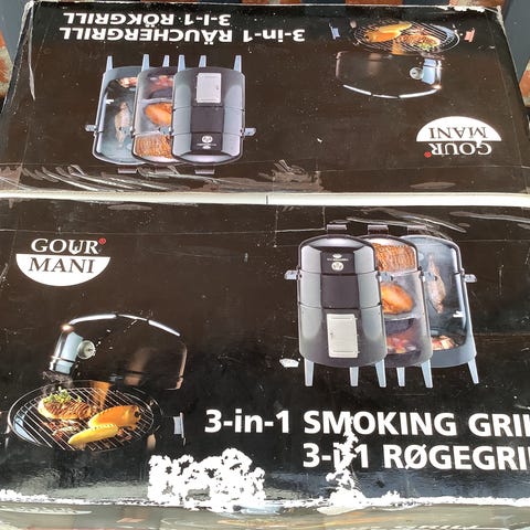 Brinkmann Smoke ’N Grill kulgrill rygeovn i sort metal. Vertikal tøndeformet grill med indbygget termometer i låget og håndtag i siderne. Velegnet til både traditionel grillning og røgning af kød, fisk og grøntsager. Grillen står på ben for stabil placering på terrassen eller i haven. Har fået den i gave for en del år siden, den har aldrig været brugt, men har været startet en gang. Skal afhentes i 9530 Støvring.