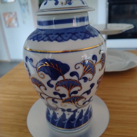 Lille kinesisk krukke. Den er rødbrun og med guld stafferinger. På den ene side er en drage og på den anden en hane. Øverst er der kvadratisk håndtag.