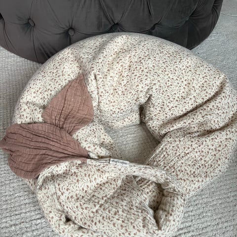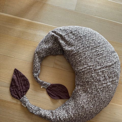 Cam Cam Copenhagen ammepude i hvid med blå bladmønster. Puden har aftageligt betræk så det kan tages af og vaskes. Formen er velegnet til amning og støtte af baby eller som støttepude til forælder under amning eller flaskegivning.