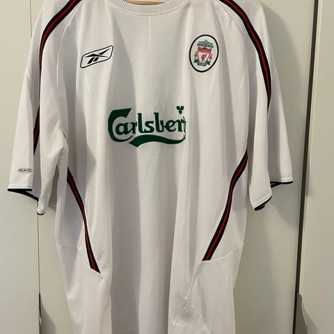 Reebok Liverpool fodboldtrøje til mænd i størrelse L. Trøjen er gul med røde og mørkeblå detaljer ved krave og ærmer. På ryggen står navnet "McManaman" og nummer 7. På fronten ses Liverpool-klubbens logo samt Carlsberg-sponsortryk. Trøjen har korte ærmer og er velegnet til fodbold eller som supportertrøje.