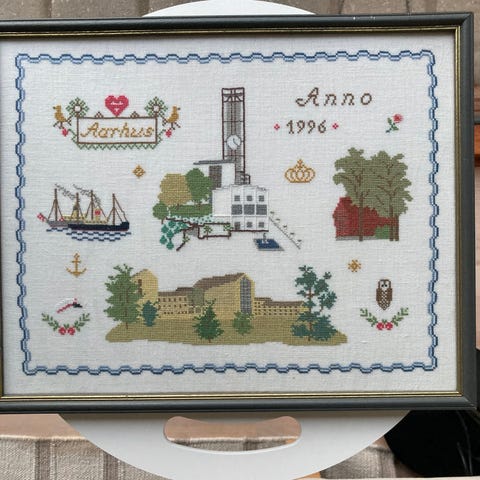 Produktet er en indrammet broderikunst med farverige motiver og tekst. Det har en træramme og er lavet med garn på stof.,Afhentes i:,Røde Kors Kolding (621),Bemærk at mail, chat og beskeder ikke besvares, og varen skal købes på knappen "Gå til varen"