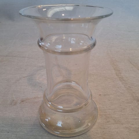 Vasen er lavet af klart glas med en elegant, slank form. Den har en bred åbning og en dekorativ midtersektion.