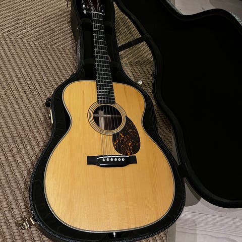 Solid Sitka spruce top, East Indian rosewood ryg og sider, OM-krop med 14 bånd til kassen. Typisk Martin-tone: varm og balanceret, med god projection, klar diskant og fyldig bas. God til både fingerstyle og strumming.
