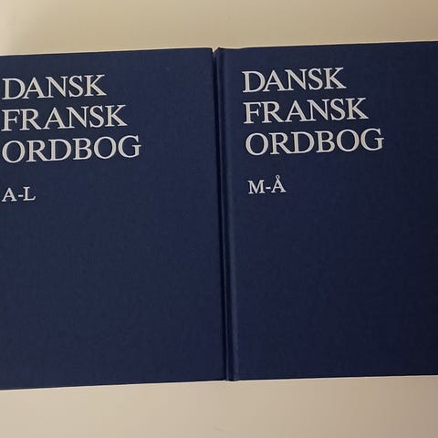 Flotte ordbøger, fransk/dansk, med pæne sider og indbundne. Det ene bind har et mindre tryk udvendig i forbindingen.