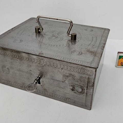 Smuk, stor og tung antik sparebøsse/bankboks fra Beaumont, Frankrig. Indgraveret med et dekorativt motiv på alle sider. Indvendigt er det burgunderrødt, med enkelte tegn på slid (se billeder). Sparebøssen er generelt i god stand. Låsen fungerer og leveres med nøgle.