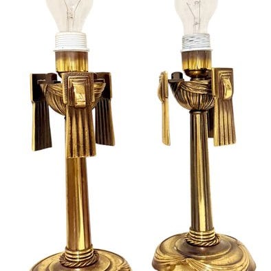 Sæt af to stående bordslamper med brun og guld skærm i jern, kobberfødder, højde 59 cm, skærmdiameter 40 cm, foddiameter 14,5 cm, fremstillet i Storbritannien, ca. 1930–1940, i god brugt stand og fungerer. Klik på den blå "gå til varen" knap, for at købe eller byde på denne vare. Den samlede pris vil blive vist inden du afgiver dit bud.
