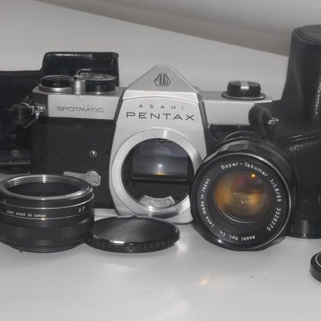 Et klassisk manuelt 35mm SLR-sæt med det velkendte Super-Takumar-standardobjektiv. Simpel, solid mekanisk fornemmelse og fantastisk til vintage filmoptagelser eller udstilling som samlerobjekt.