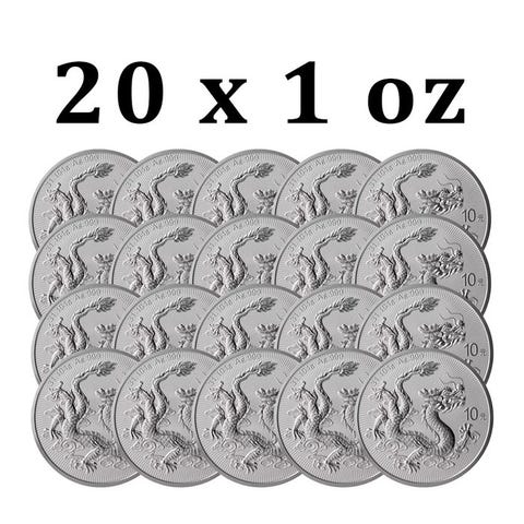 Fem 2025 1 oz ¥10 CNY kinesiske sølvdrage-mønter i Brilliant Uncirculated-stand, hver 1 oz af .999 ren sølv (31,104 g) med en diameter på 38 mm, præget af Chinese Mint, juridisk betalingsmiddel med pålydende ¥10 CNY og en samlet produktion på 2.000.000. Klik på den blå "gå til varen" knap, for at købe eller byde på denne vare. Den samlede pris vil blive vist inden du afgiver dit bud.