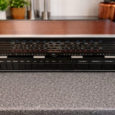 Enheden er i pæn vintage stand med normale brugsspor i overensstemmelse med dens alder. Den originale aluminium frontplade, glasdisplaystrimler og træsidepaneler er til stede.