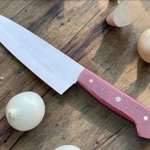 Håndtaget fremviser et markant rødt og sort marmoreret design, skabt til både visuel appel og ergonomisk komfort. Fastgjort med polerede messingnåle tilbyder håndtaget et solidt, afbalanceret greb der reducerer træthed i hånden ved længere brug. Med en kombination af funktionalitet og markant stil er kniven en pålidelig og iøjnefaldende tilføjelse til ethvert