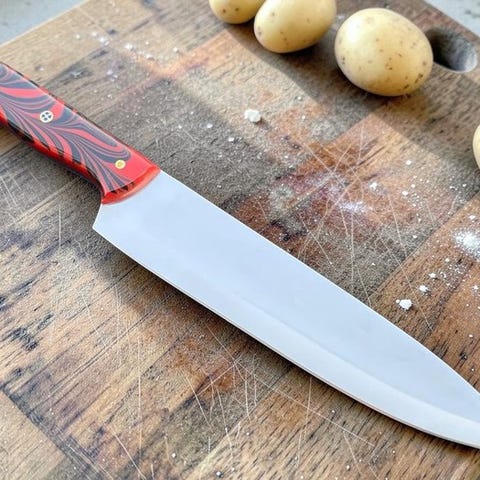 Håndtaget fremviser et markant rødt og sort marmoreret design, skabt til både visuel appel og ergonomisk komfort. Fastgjort med polerede messingnåle tilbyder håndtaget et solidt, afbalanceret greb der reducerer træthed i hånden ved længere brug. Med en kombination af funktionalitet og markant stil er kniven en pålidelig og iøjnefaldende tilføjelse til ethvert