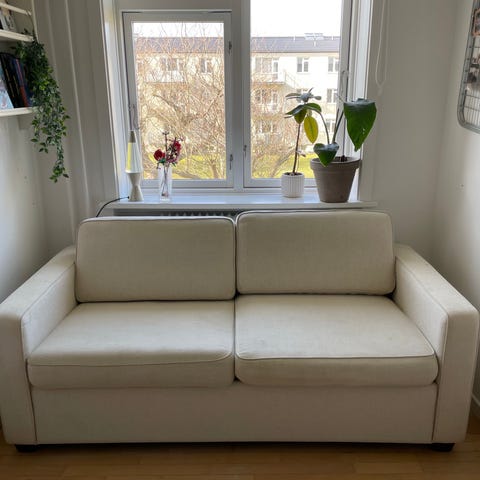 Sofaen er godt brugt, men stadig i okay stand. Den kan slås ud til dobbeltseng størrelse, og der er opbevaring i L’et til dyner eller andet.