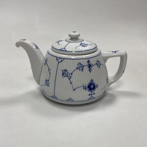 Royal Copenhagen Musselmalet Riflet Oval Tekande No. 253. Måler 9,5 cm / 3,74 in. i højden uden låg. Måler 12,5 cm x 9 cm / 4,92 in. x 3,54 in. uden hank og tud. 1. Sortering i fin hel stand.