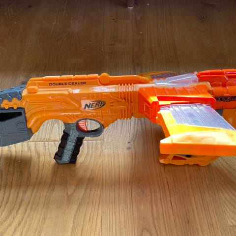 Nerf Retaliator legetøjsblaster i blå, orange og hvid plast. Blasteren består af en grundblaster med aftagelig kolbe, aftageligt løb og ekstra frontgreb. Magasinet er placeret under blasteren. Egnet til brug med standard Nerf-skumdarts (6 stk.). Velegnet som legetøj til indendørs og udendørs skudlege for børn.