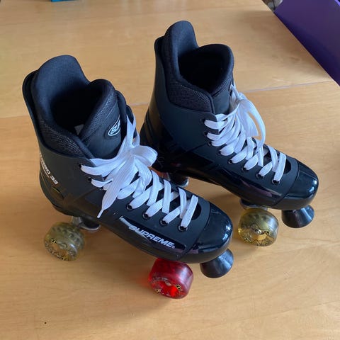 Supreme rulleskøjter str. 40 i sort. Klassiske side-by-side rulleskøjter med høj støvle og snørelukning. Skøjterne har fire hjul og bremseklods foran. Velegnet til rulleskøjteløb på jævne underlag. Størrelse 40 angivet på pløsen.