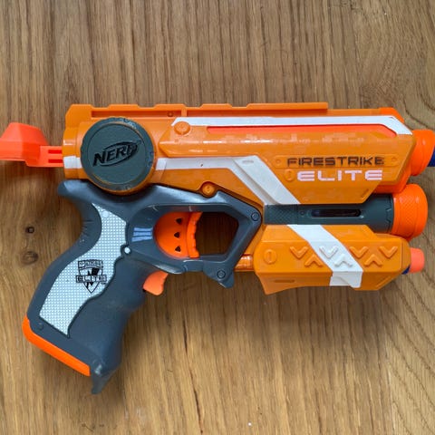 Nerf Elite Disruptor legetøjspistol i blå, orange og hvid plast. Modellen har drejetromle til 6 skumdartpile og pistolgreb med aftrækker. Egnet til leg med Nerf-skumprojektiler både inde og ude.