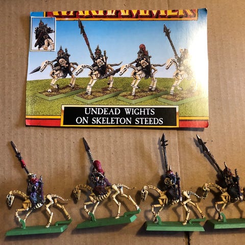 Warhammer Fantasy Undead Mounted Wight Horn Blower, Bearer og Champion. Figurerne er metal, hestene er plastic. Meget sjældne figurer