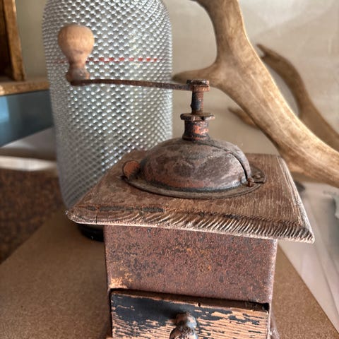 Kaffemølle, Metal og træ, 100 år gl., En rigtig fin kaffemølle cirka 100år i fin stand møllen er 25cm høj og 12cm i diameter meget dekorativ