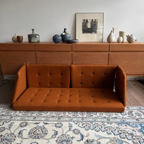 Hyndesættet er nypolstret med nyt skum og med nyt stof. Tonus 4 fra Kvadrat. Knapper med sort læder.