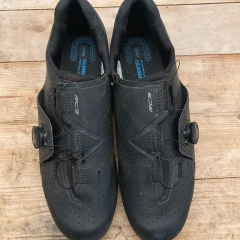 Shimano RC3 cykelsko i størrelse 44. Modellen er en landevejscykelsko i sort farve med BOA-lukning og justerbare remme. Overdelen har perforeringer for ventilation, og skoen er designet til brug med klikpedaler til landevejscykling. Velegnet til cyklister, der ønsker en fast og stabil pasform til træning og pendling.