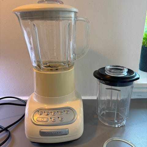 Kitchen Aid blender med glaskande i sort. Blenderen har en kraftig motorenhed med flere hastighedsindstillinger og pulse-funktion, som styres via betjeningspanelet på fronten. Glaskanden har tydelige måleangivelser og låg med aftagelig indsats. En ekstra mindre beholder med låg følger med, egnet til mindre portioner. Velegnet til tilberedning af smoothies, supper og andre blendede retter i køkkenet.